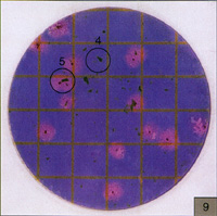 ![]() 食物顆粒是不規(guī)則形狀可能呈紅,藍(lán)或綠色(如圓圈4). 當(dāng)二個(gè)金黃色葡萄球菌生長(zhǎng)的相當(dāng)靠近的時(shí)候,會(huì)導(dǎo)致其Tnase 環(huán)帶.計(jì)數(shù)時(shí),請(qǐng)視為二個(gè)菌落(如圓圈5). |
