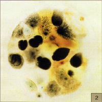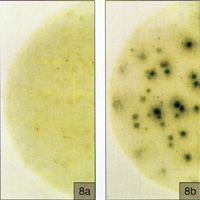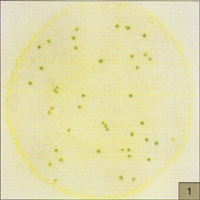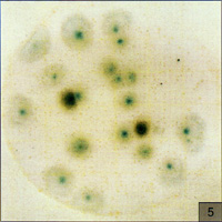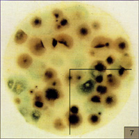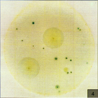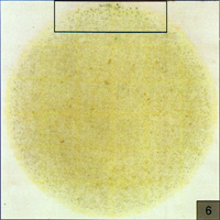 ![]() 圖6所示在PYM測(cè)試片邊緣框里光亮區(qū)的的小型.蘭色菌落同樣也分布在整個(gè)測(cè)試片中(盡管有較小的可見度),這是膠木菌菌落太多無(wú)法計(jì)數(shù)(TNTC)現(xiàn)象. |